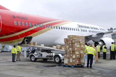 “希望航班”首批近3吨(美制)医疗用品抵达中国后,将由深航国内航班转运至成都机场。抵达成都后,美慈组织将与中华全国青年联合会一道将物资发往灾区。