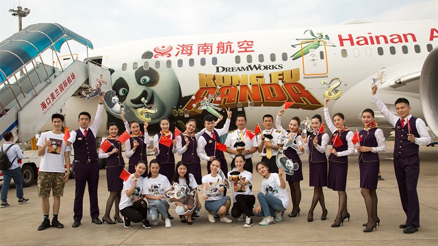 2016年10月1日,海南航空 “功夫熊猫”主题涂装波音787-9飞机惊艳亮相并完成首航,熊猫阿宝、师父、悍娇虎、仙鹤、螳螂、灵蛇、金猴的形象登上同时海航波音787-9飞机。